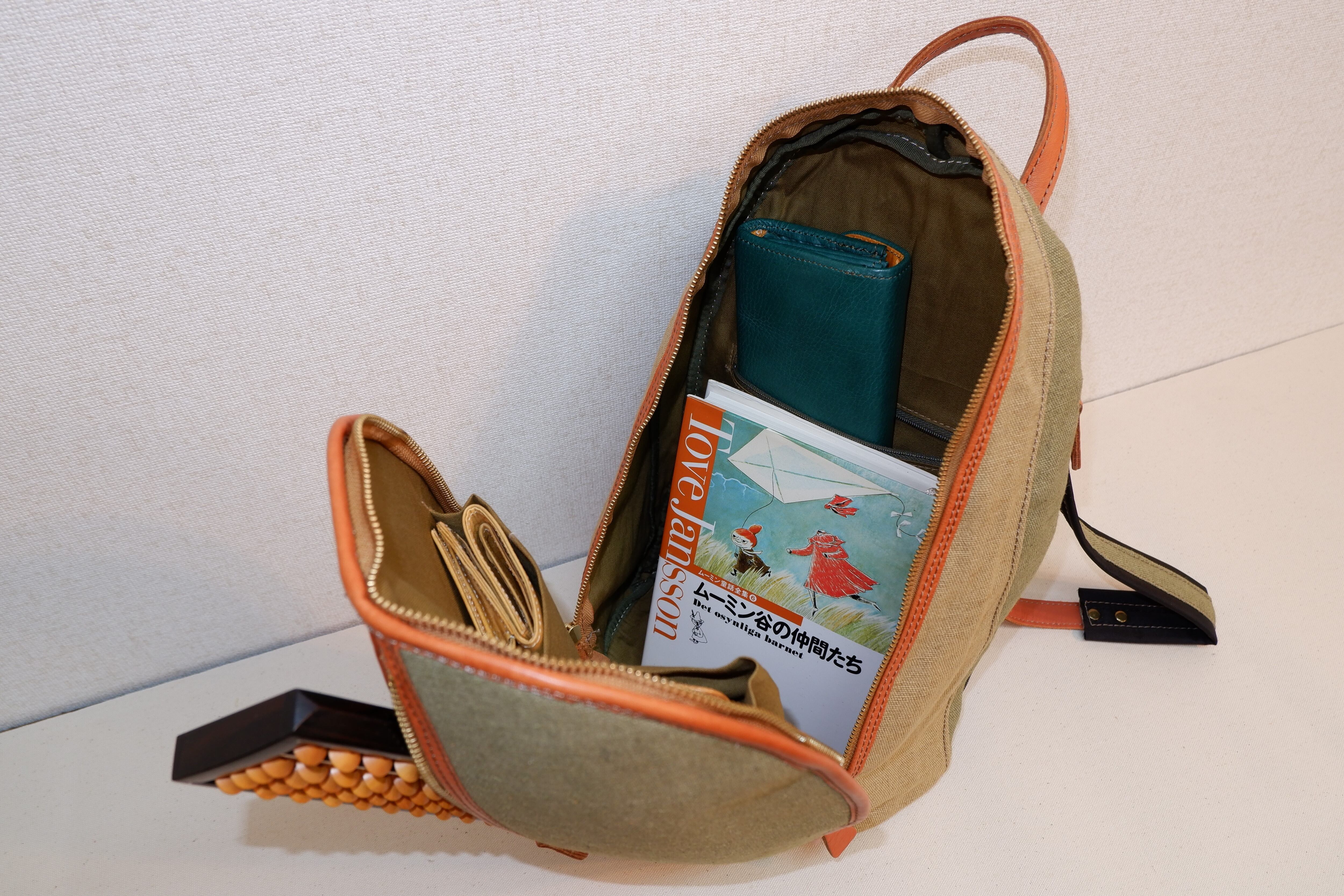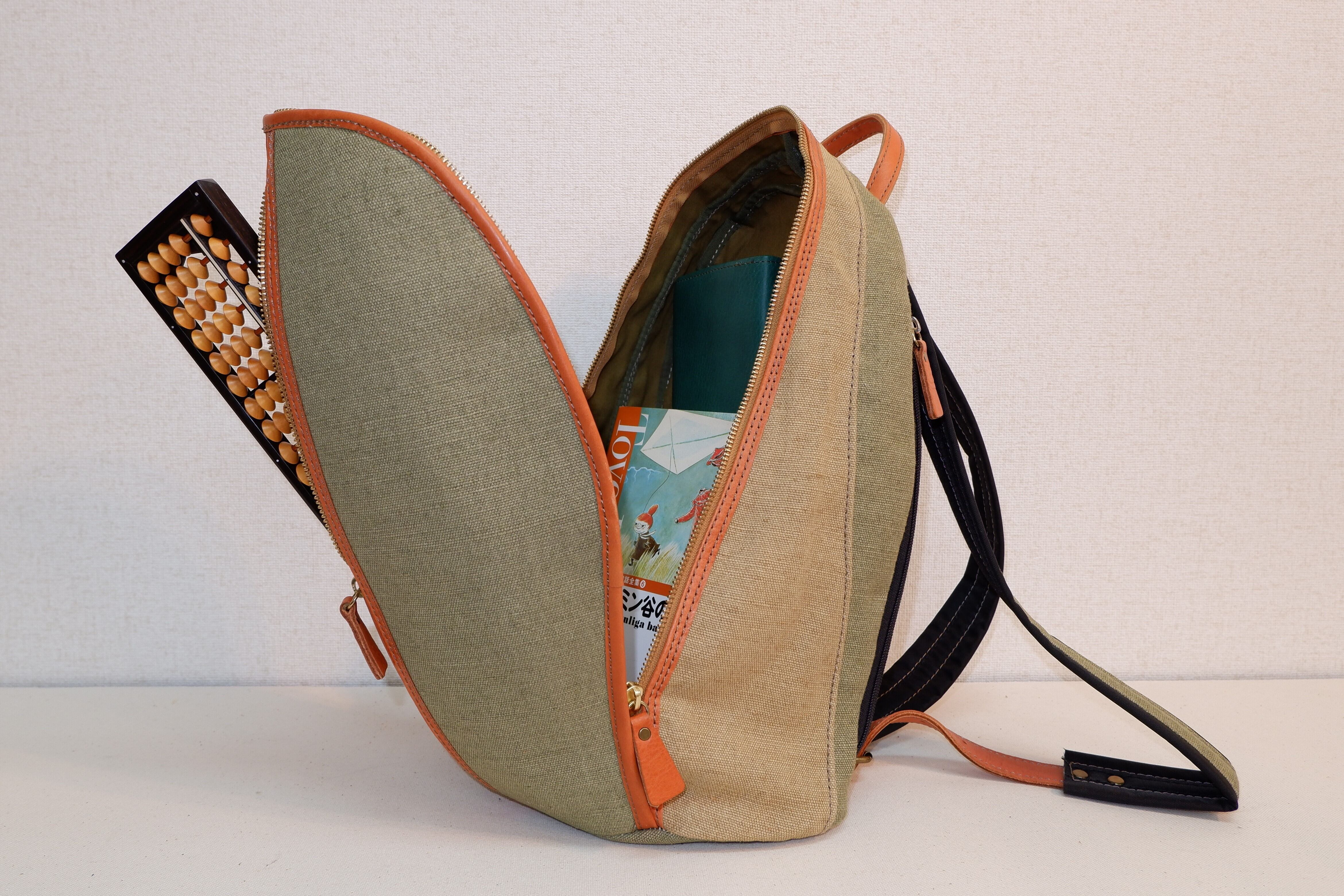 リネン生地に本牛革をあしらって作ったリュックサックです。
