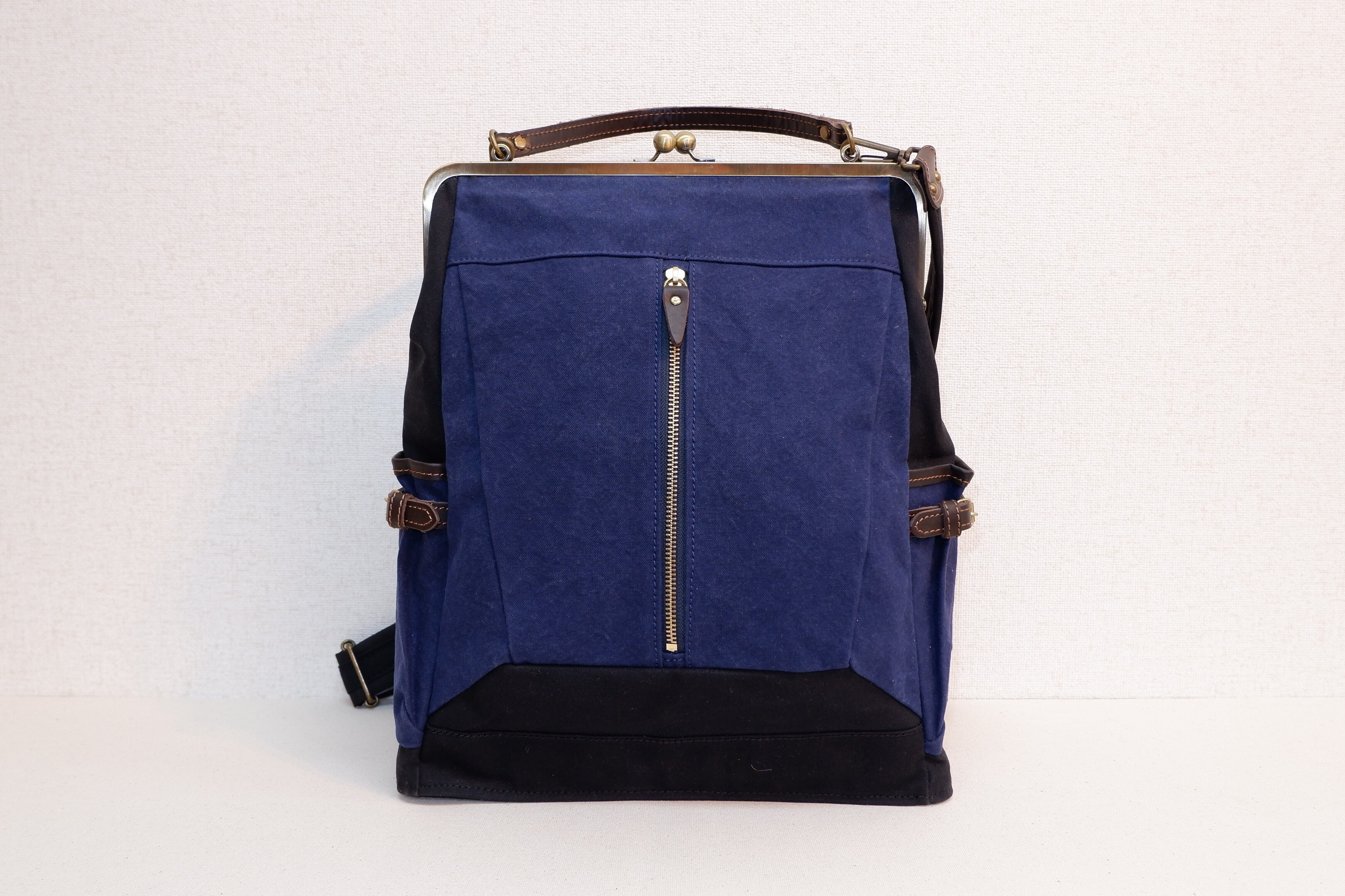 帆布パラフィン加工の生地と本牛革で30㎝の口金を使いリュックを作成しました。