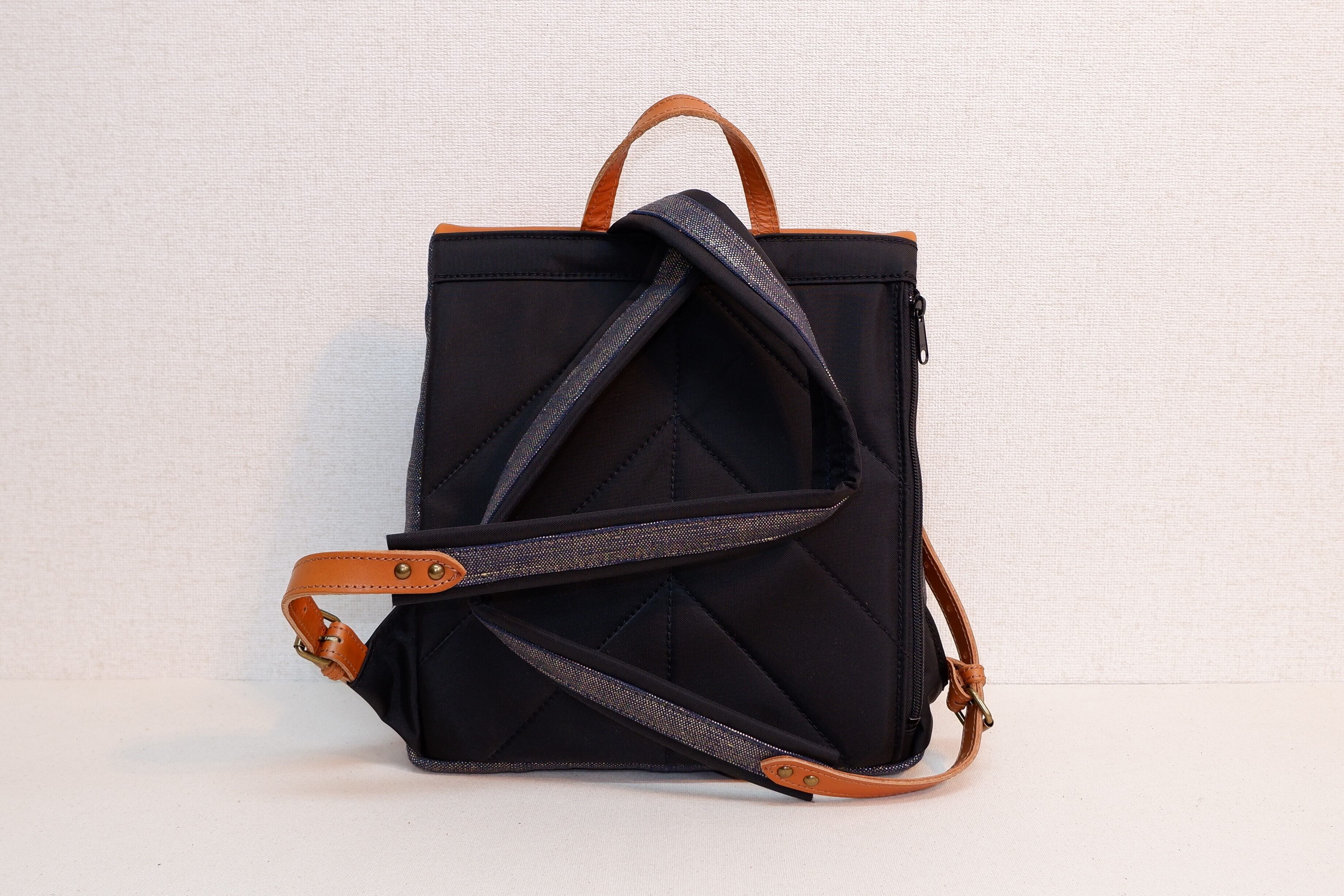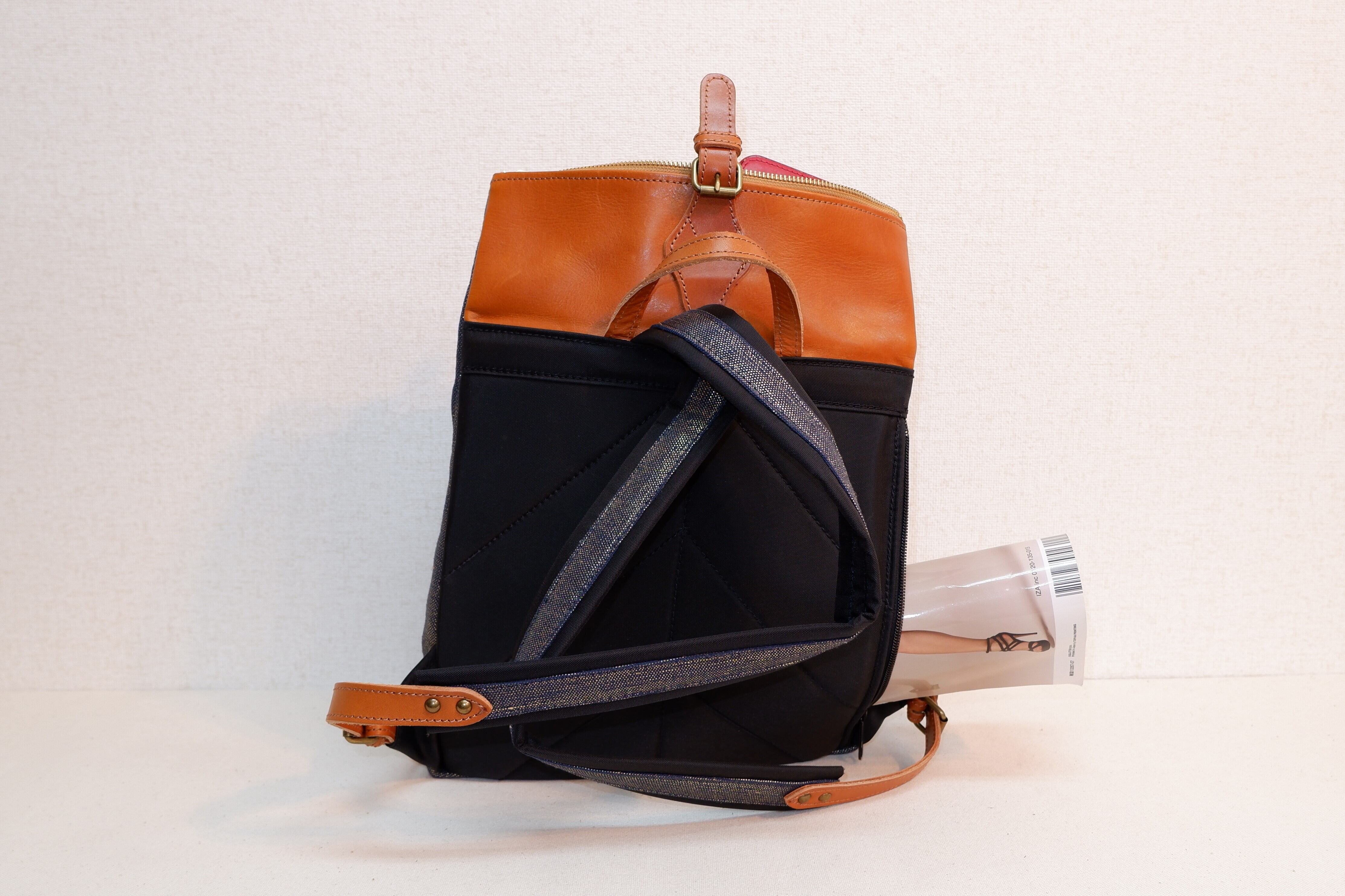 ベージュの本牛革と箔押し麻布で作ったリュックです。